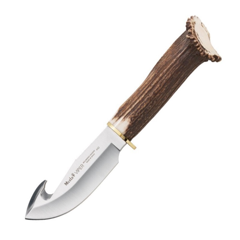 Lovecký stahovací nůž Muela VIPER-11S vhodný ke stahování ulovené zvěře z kůže. Čepel je opatřena párákem a je vyrobena z oceli 440. Bezpečnost zajišťuje mosazná záštita. Rukojeť z jeleního parohu se dobře drží v rukou a je zakončena růžicí. Dodává se s hnědým koženým pouzdrem.